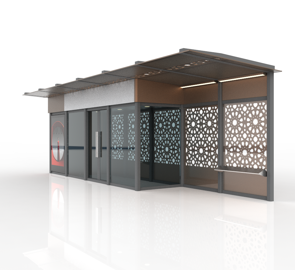 Rusuu Custom Enclosed Bus Shelter with Air Conditioning for Middle East. Featuring heat-resistant glass, anti-corrosion steel structure, LED lighting, and smart control system. Ideal forDubai,Abu Dhabi,Riyadh, Iraq, GCC, and high-temperature urban projects.